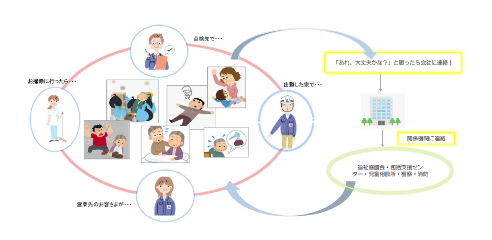 多くの市民が日常の様々な生活の場面において、「あれ?どうしたのかな?」「ちょっと気になるな…」など、「なにげなく気にかける」「さりげなく見守る」ことによって、高齢者のかたなどの異変に気づいたら、行政や民生委員等に連絡をする活動です。