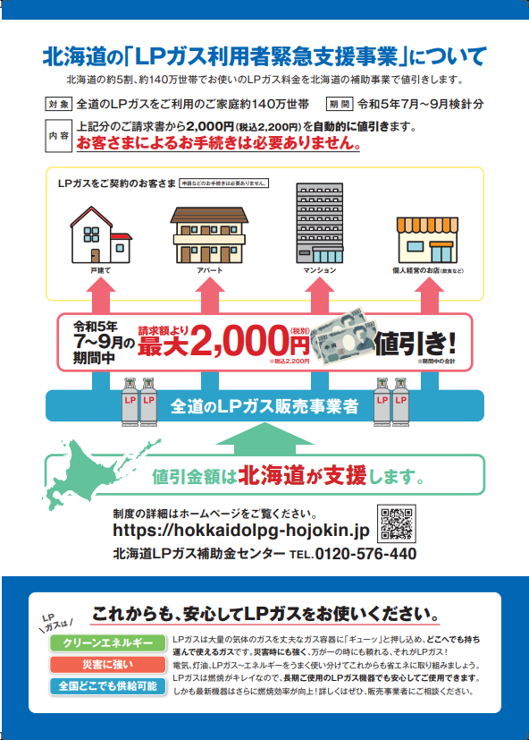 北海道では、LPガス料金の上昇により影響を受けている利用者のみなさまの負担軽減を図るため、LPガス販売事業者を通じて、利用料金の値引きを実施します。