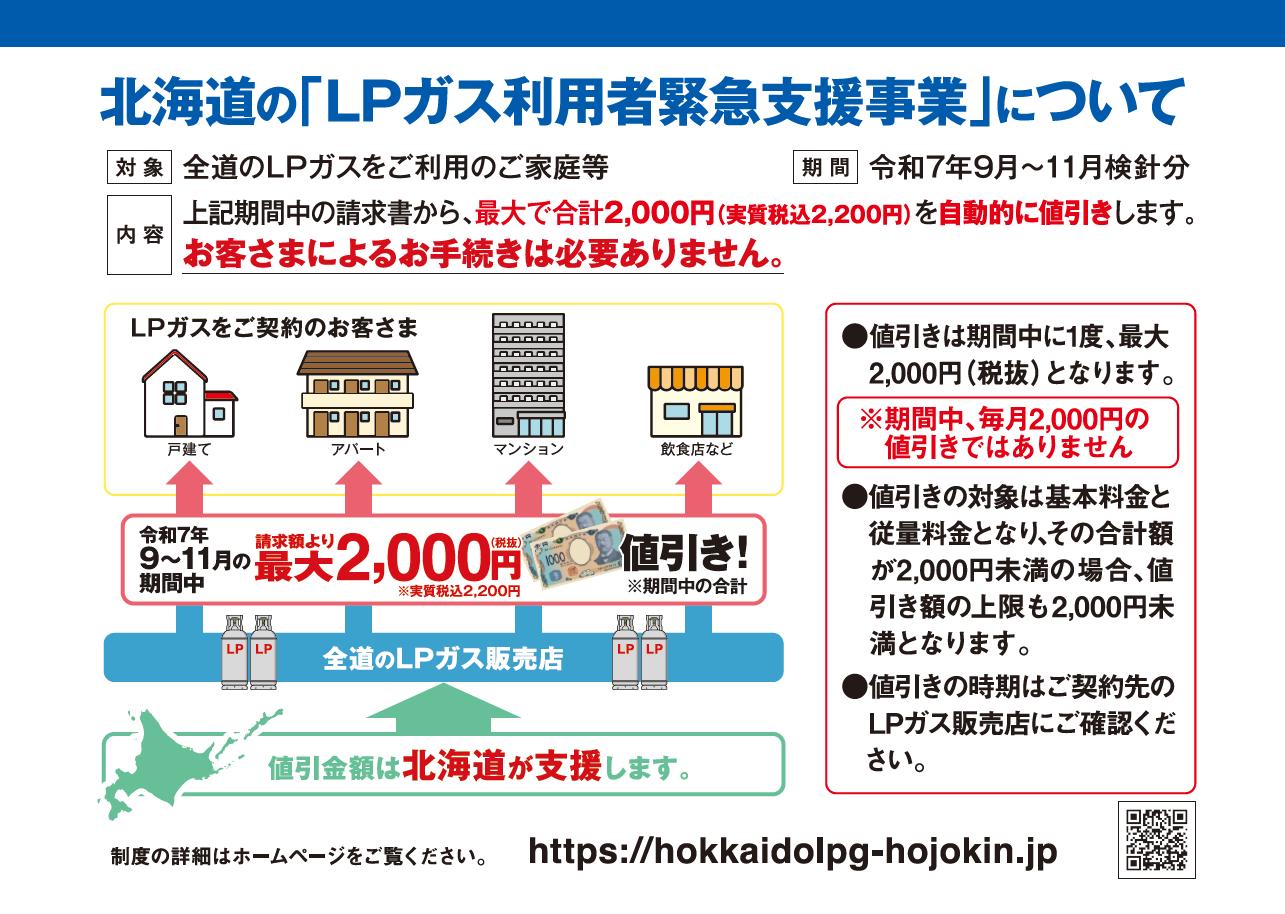 北海道では、LPガス料金の上昇により影響を受けている利用者のみなさまの負担軽減を図るため、LPガス販売事業者を通じて、利用料金の値引きを実施します。