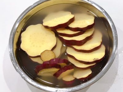 さつまいもはよく洗い、皮付きのまま約1cm幅の輪切りにして水にさらす。