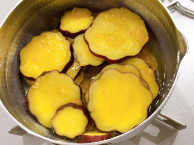 さつまいもを約10分ゆでる。お湯の量がさつまいもの高さの約2/3になるまでゆで、ジャムを加える。