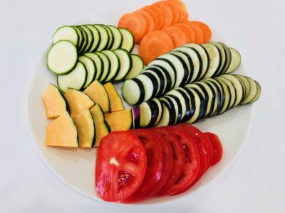 野菜の下準備をする。ズッキーニ、ナス、トマトは3mmの輪切りにする。かぼちゃ、人参は2mmでナスの大きさに合わせる。