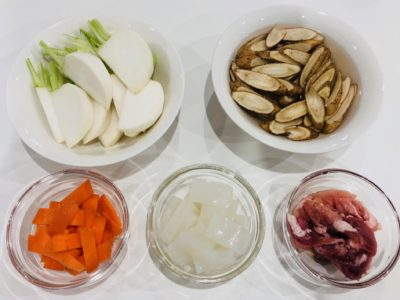 ごぼうは根元を切り落とし、包丁の背を表面にあてて動かし、軽く皮をこそげとり、斜め切りにして水にさらす。
