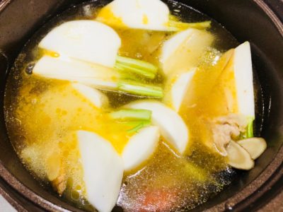 だし汁を加えて一煮立ちさせたら、かぶ、こんにゃく、しょうがを加え、みそを入れて味を調える。かぶに火が通ったら完成。