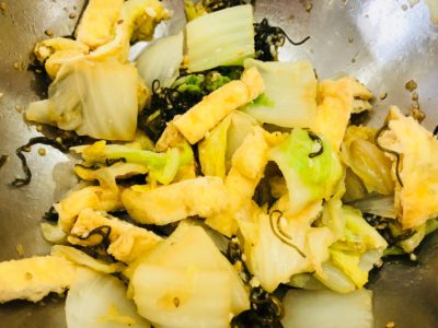 塩麹、おろし生姜、しょうゆを混ぜ合わせ、白菜、油揚げ、昆布、白ごまを入れてよく混ぜ合わせる。