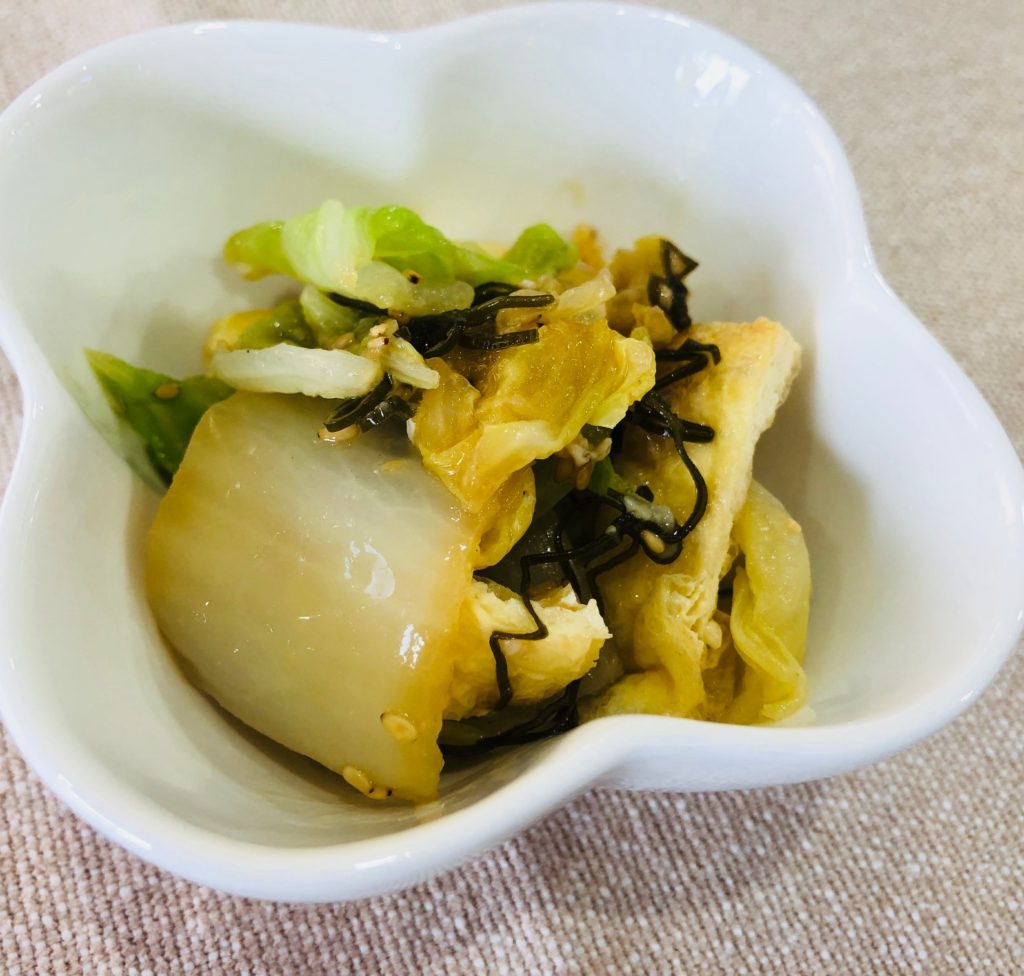 塩麹、おろし生姜、しょうゆを混ぜ合わせ、白菜、油揚げ、昆布、白ごまを入れてよく混ぜ合わせる。