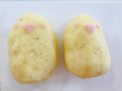 ロースハムでお雛様とお内裏様の口とほっぺを作る。(小さい丸と三角形に切る。丸はストローでくり抜く)