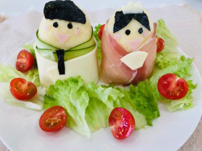 スライスチーズで冠と檜扇を作る。生ハムをお雛様のお着物、ピーラーで薄く長くスライスしたきゅうりとスライスチーズをお内裏様のお着物にする。