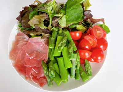 アスパラは根元を1㎝ほど切り落とし、根元から3㎝くらいのところまでピーラーで皮をむく。4㎝ほどの長さに切ってゆでる。 生ハムは食べやすい大きさに切り、ミニトマトはヘタを取って半分に切る。 ベビーリーフは食べやすい大きさにちぎる。