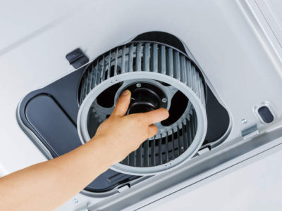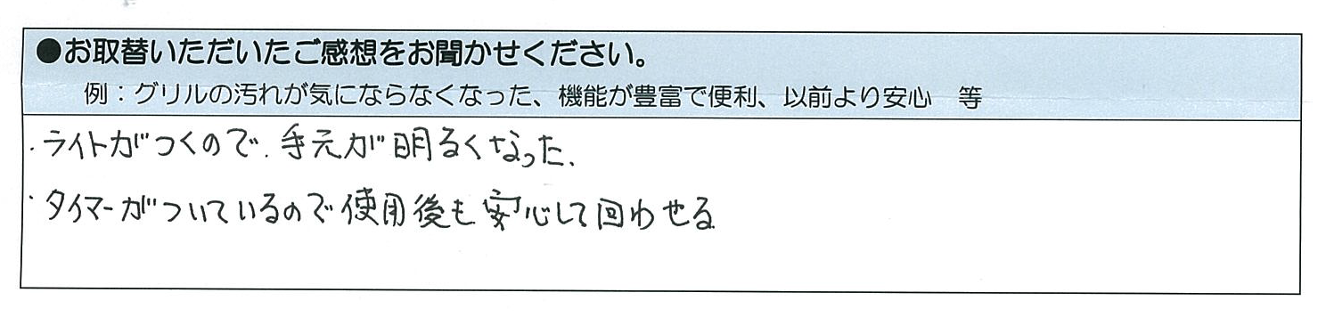 平型レンジフードをお使いのお客さまからは「回した時の音も大きく、ファンを外すのが大変だからお掃除も面倒で…」というお声を多く耳にします。今回お取付させていただいたレンジフードは、音も静かでファンはワンタッチで外れ、女性でもお掃除ラクラク♪ LED照明が手元を明るく照らします。