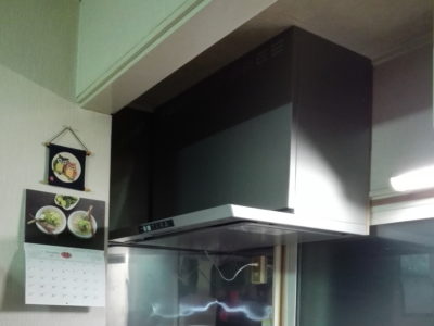 以前はコンロの直上に設置されておらず、半分くらい(30cm)しか覆っていませんでした。取替によって、位置を変更せず幅を大きくする事(60cmから90cmへ)を提案させて頂きました。これによりコンロをすっぽり覆うことができました。プロペラファンからの変更も合わせてお手入れが格段に楽になって頂けると確信いたします。