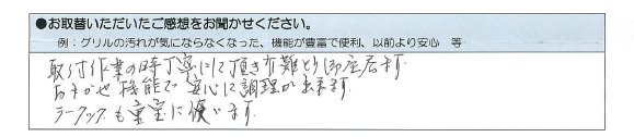 コンロから距離がありプロペラタイプの為、手が届かず掃除が大変でした。また、コンロの真上に設置されていない為、しっかり吸い込みができないので北ガスさんに相談しました。