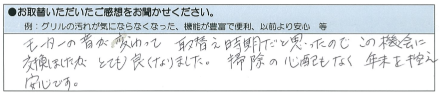 モーターの音が変わって取替時期だと思ったので、この機会に交換しました。